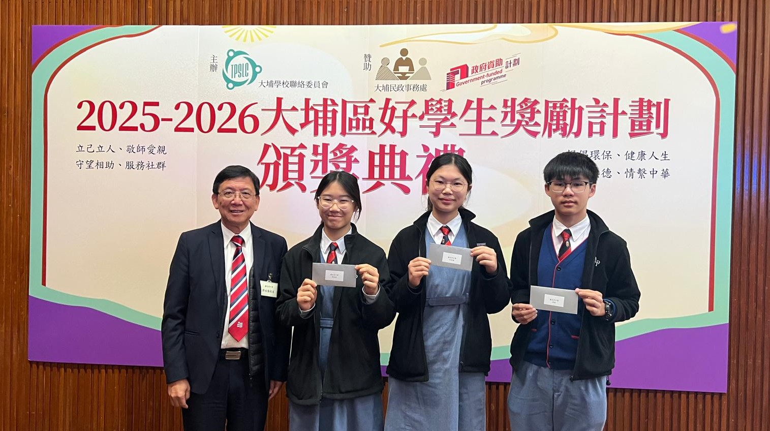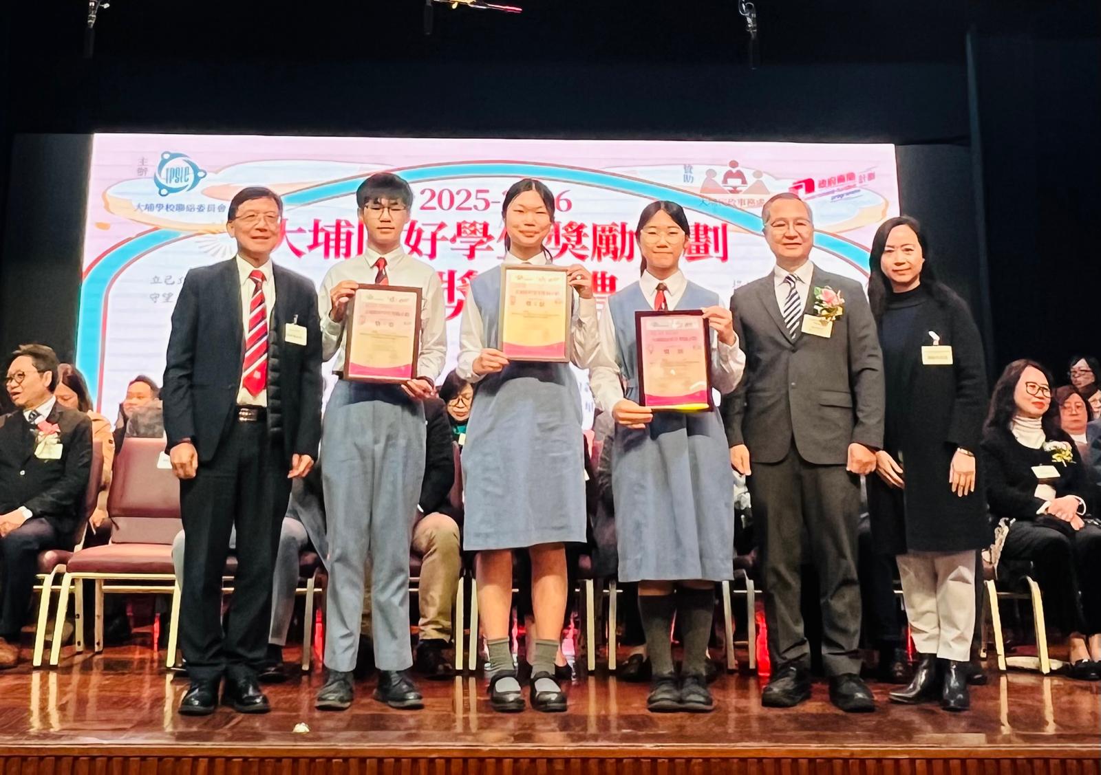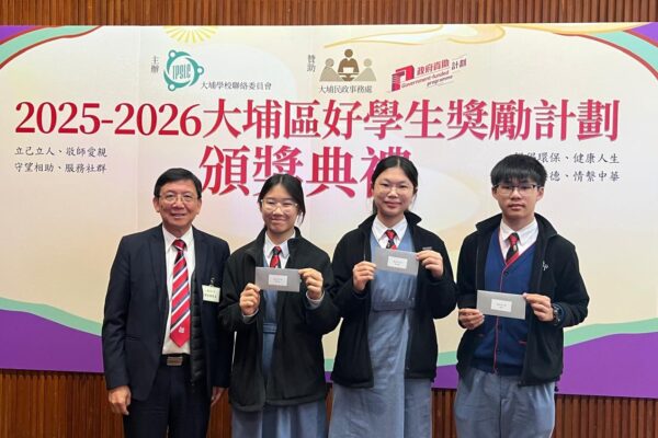 The prize presentation ceremony of the Tai Po Good Student Award, which is organised by the Tai Po School Liaison Committee and sponsored by the Home Affairs Bureau was held on 10 February 2026. Three of our student representatives: S3 Cheung Mimzy Hoi Ching, S4 Chu Tsoi Yi and S5 Leung Chun attended the ceremony and received the awards that recognises their excellent performance across six meaningful areas: